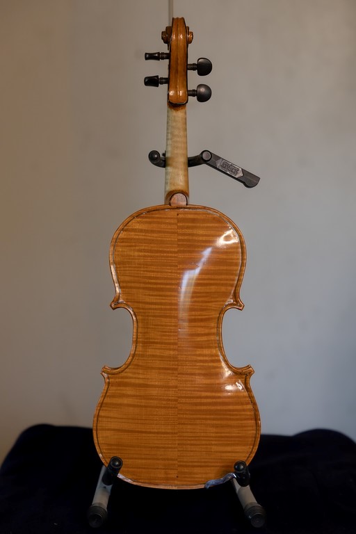 This violin starts it’s life as European maple and spruce. I buy my tone wood from International Violin and they handle only European woods. I use a top quality ebony fingerboard that’s carved to perfection with just the right amount of scoop. Pegs , chin rest and tail piece are also ebony,or sometimes rosewood or boxwood. The tail piece will be composite if it has built in fine tuners. Regardless of the appointments added be it ebony or something of a different species, it all works together to accentuate the aesthetics. I finish it with a burnt sugar ground coat topped with either a colored Italian oil varnish or a transparent artist paint as a glaze and then finished with oil clear gloss varnish. Then its hand rubbed all the way to 12,000 grit Micromesh sanding material. Then buffed and polished to a super high gloss.